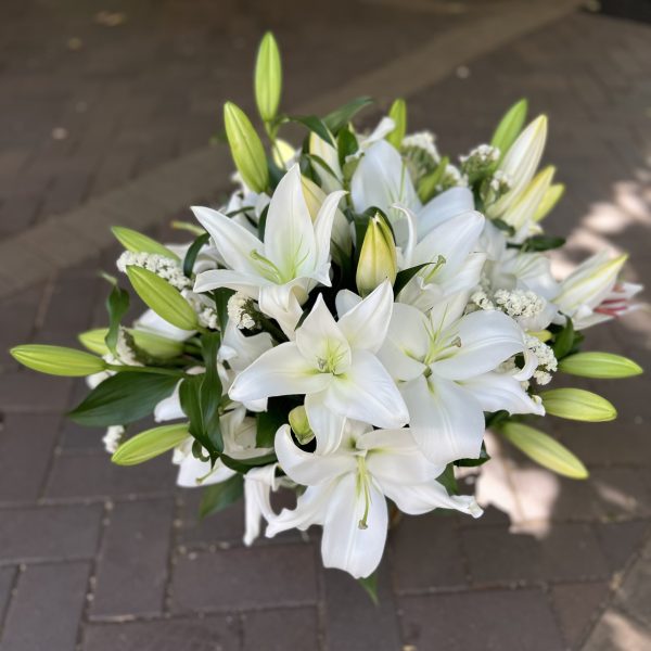 Elegant and intoxicating, this bouquet showcases the timeless beauty of Oriental lilies at their seasonal peak. With their large, star-shaped blooms and rich fragrance, these lilies come in a palette of soft pinks, creamy whites, and blush tones; each petal edged with delicate ruffles. Accented with glossy green foliage, this bouquet brings a sense of luxury and serenity—perfect for celebrating life’s special moments or simply brightening your space with natural grace and scent.