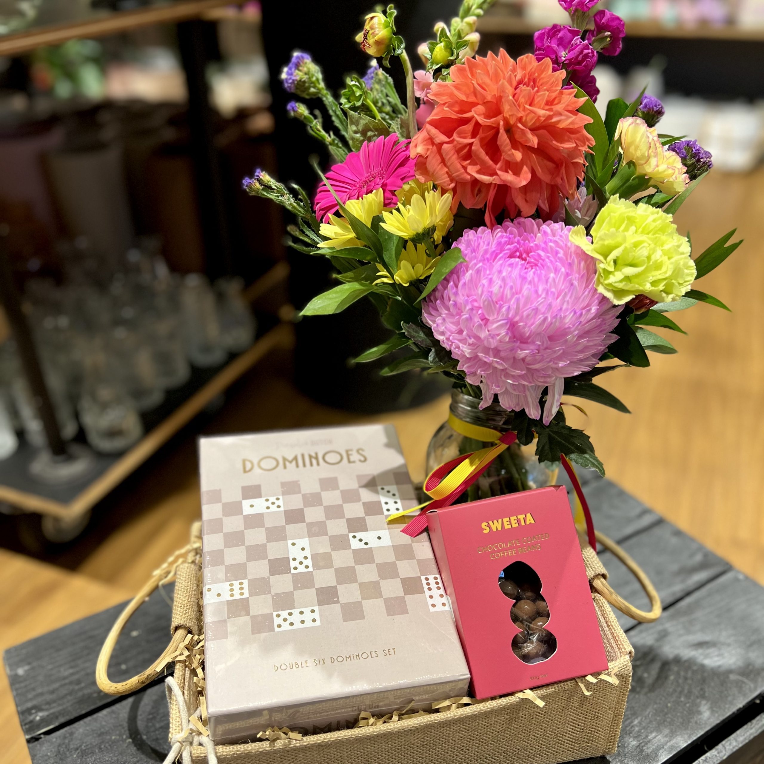 Bring a little joy to their day with our Playful Blossom Box — a cheerful mix of treats designed to lift spirits and spark a smile. Inside you’ll find a board game for some easy fun, a sweet chocolate treat to nibble on, and a fresh spring posy vase bursting with bright, happy blooms.